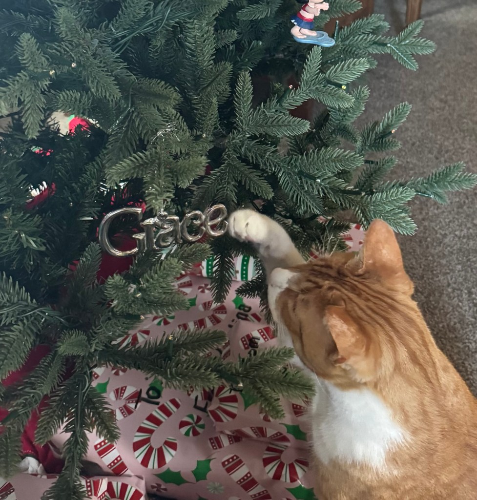 A few days ago, our sweet tabby cat Nemo was playing with ornaments on our Christmas tree. I felt like it was Providence that he chose the shining silver ornament he fixated on with the word, Grace. As Nemo was spinning it around I was thinking about the message of Christmas and the gift of Jesus.