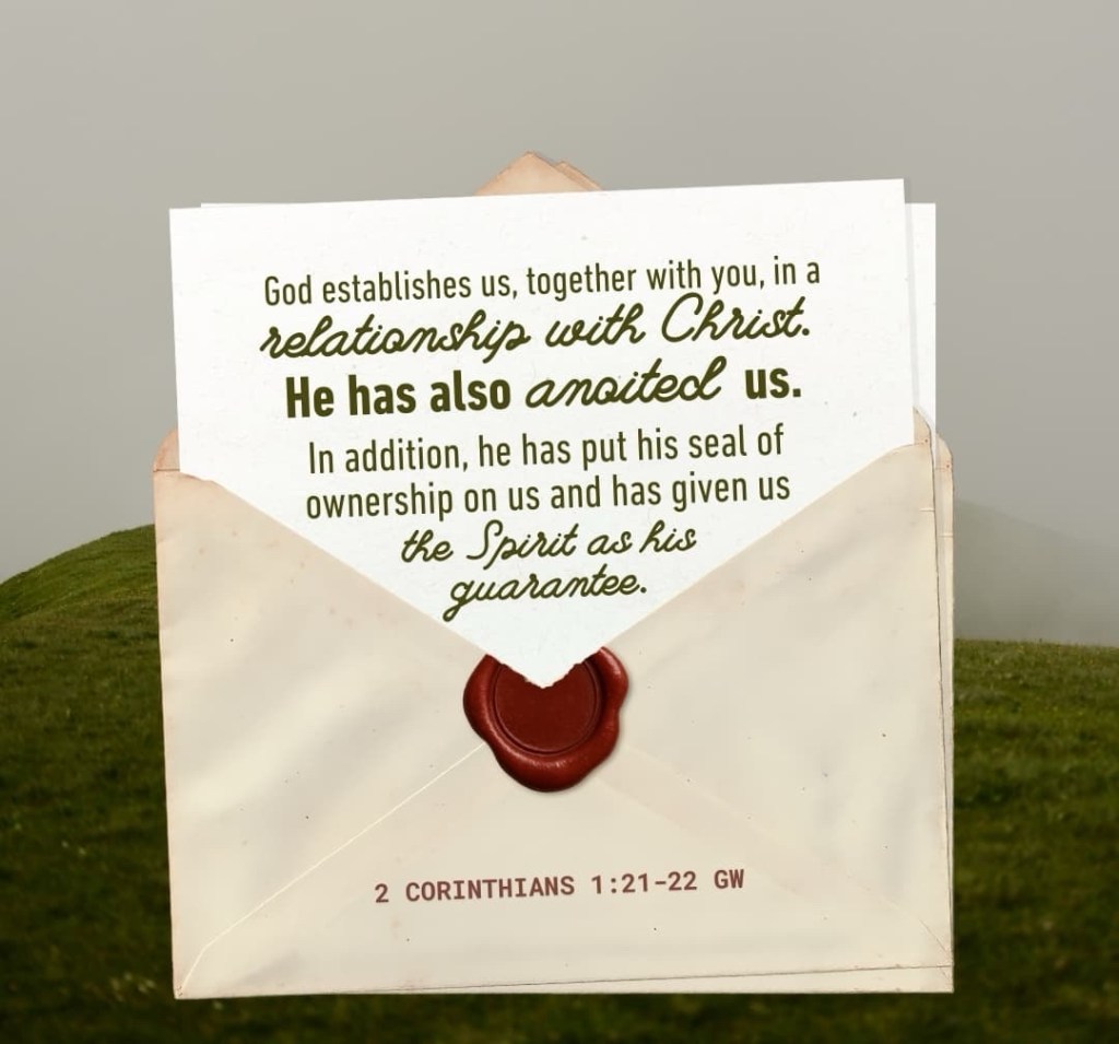 [20] For all of God’s promises find their “yes” of fulfillment in him. And as his “yes” and our “amen” ascend to God, we bring him glory! [21] Now, it is God himself who has anointed us. And he is constantly strengthening both you and us in union with Christ. [22] He knows we are his since he has also stamped his seal of love over our hearts and has given us the Holy Spirit like an engagement ring is given to a bride—a down payment of the blessings to come!